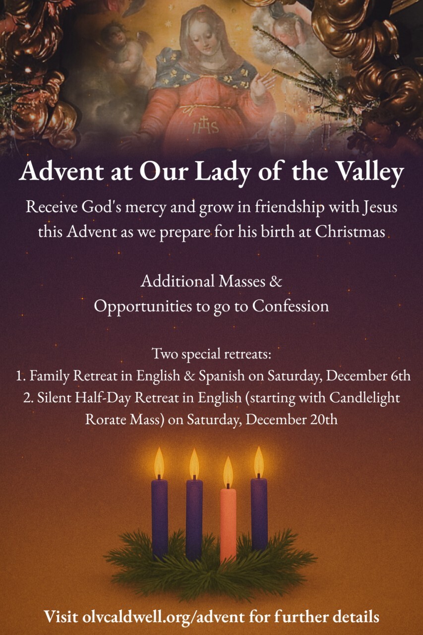 12/20 Rorate Mass (630am) & Silent Retreat (630am-1230pm) - Everyone is welcome to attend the Rorate Mass without registering - To register for the silent retreat, click here: https://olvcaldwell.org/silentretreat